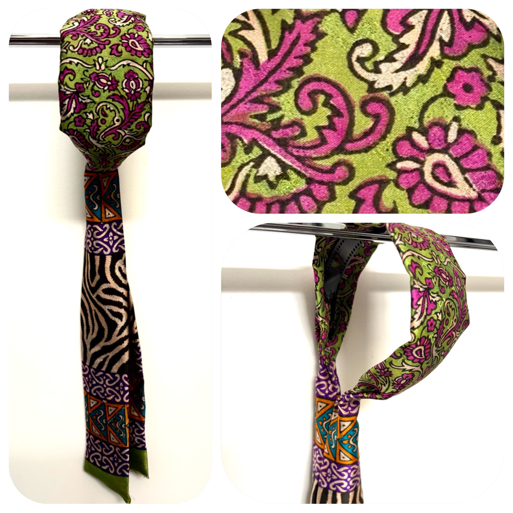 Late 90’/early 2000's tribal motif. Lime green with hint of yellow and magenta leafy top print with purple, orange blue and zebra printed tails. Indian silk